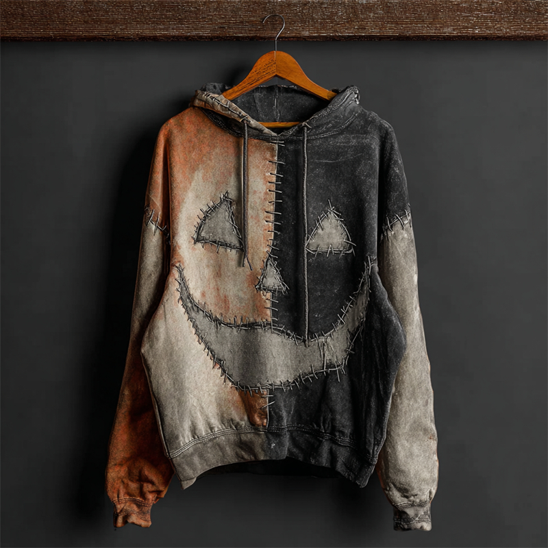 Halloween Pumpkin Face Contrast Patchwork Washed Hoodie