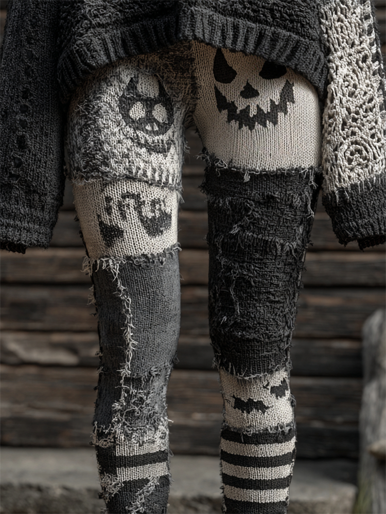 Halloween Pumpkin Face Frayed Patchwork Cozy Knit Leggings