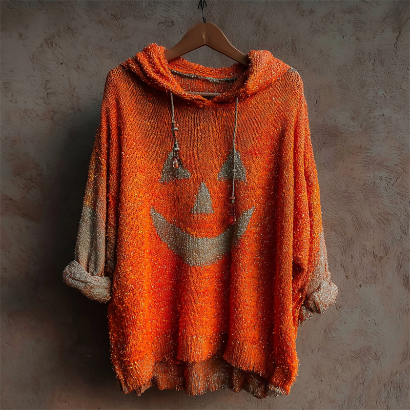 Halloween Pumpkin Face Glitter Sequins Bleached Cozy Knit Hooded Sweater