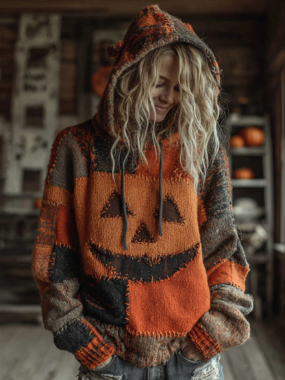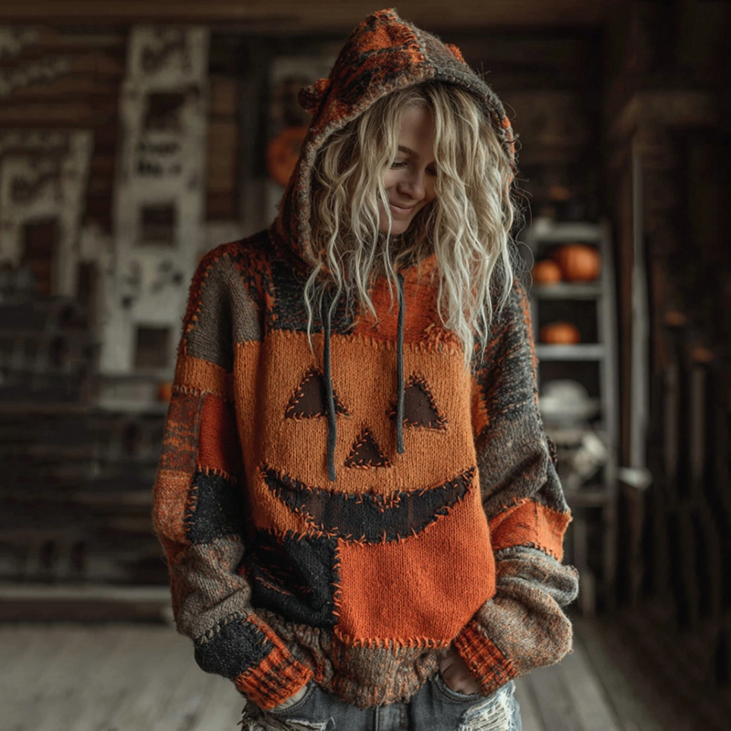 Halloween Pumpkin Face Patchwork Stitched Cozy Knit Hooded