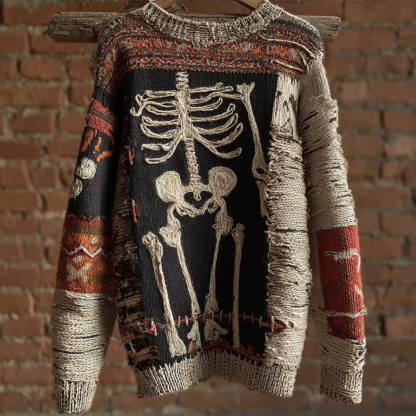 Halloween Skeleton Man Pattern Knit Round Neck Sweater