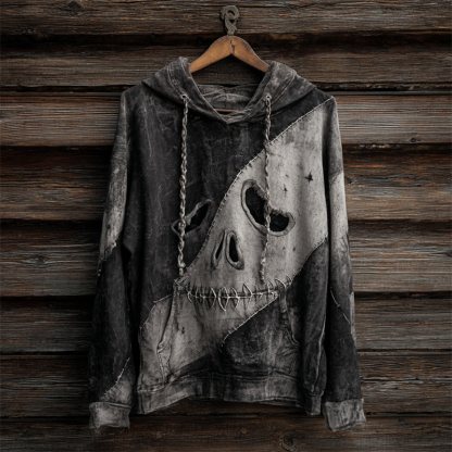 Halloween Skull Face Colorblock Stitched Washed Hoodie