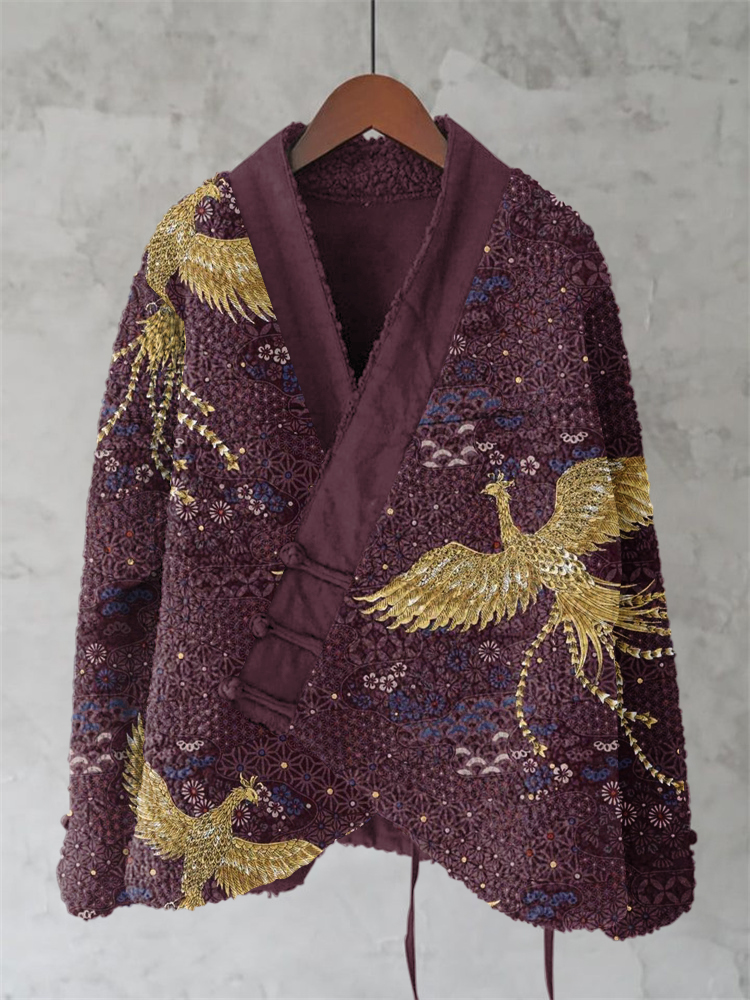 Japanese Style Gold Stamped Phoenix Art Pattern Plush Kimono Cardigan