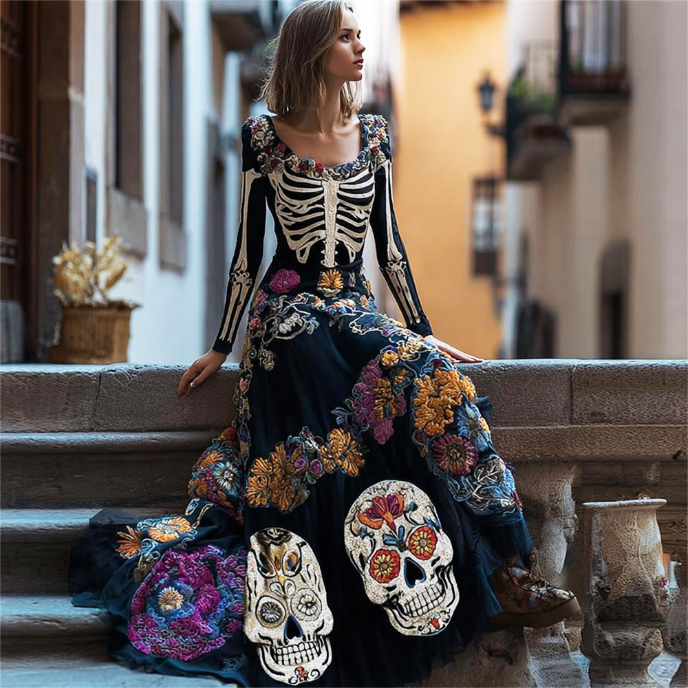 Mexican Skull & Skeleton Embroidered Women's Long-sleeved Flowing Maxi Dress