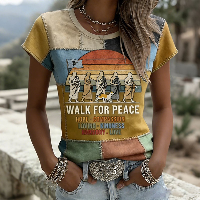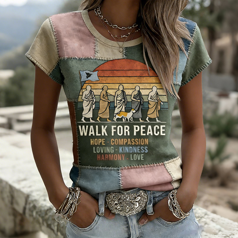 Retro 2026 Walk For Peace Artistic Patchwork Print T-shirt