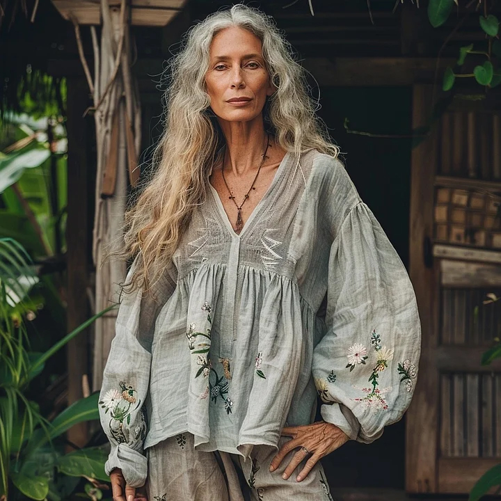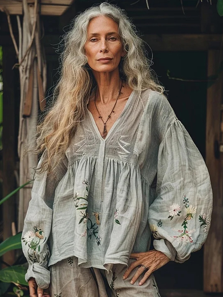 Retro Bohemian Linen Floral Art Print Long Sleeve V-neck Shirt