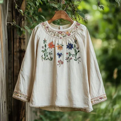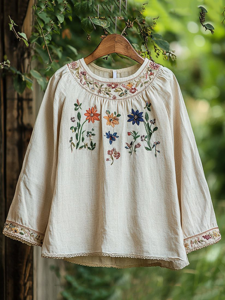 Retro Floral Embroidery Art Print Cotton And Linen Blend Loose Blouse
