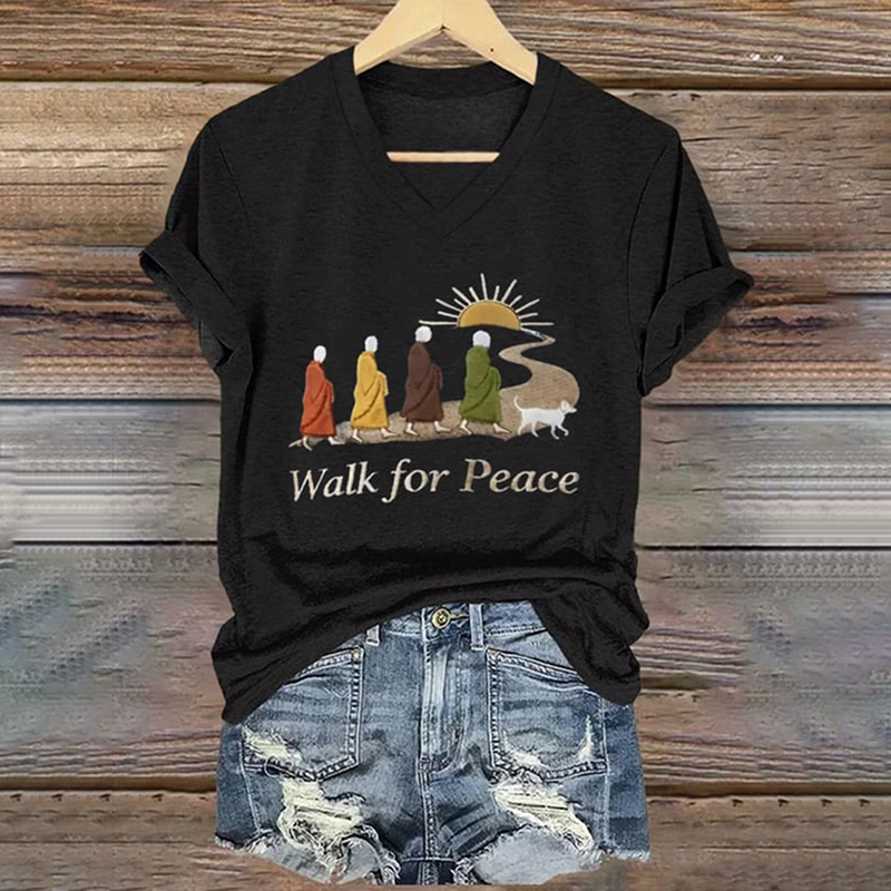 Retro Peace Monk Aloka Dog Print V-neck T-shirt