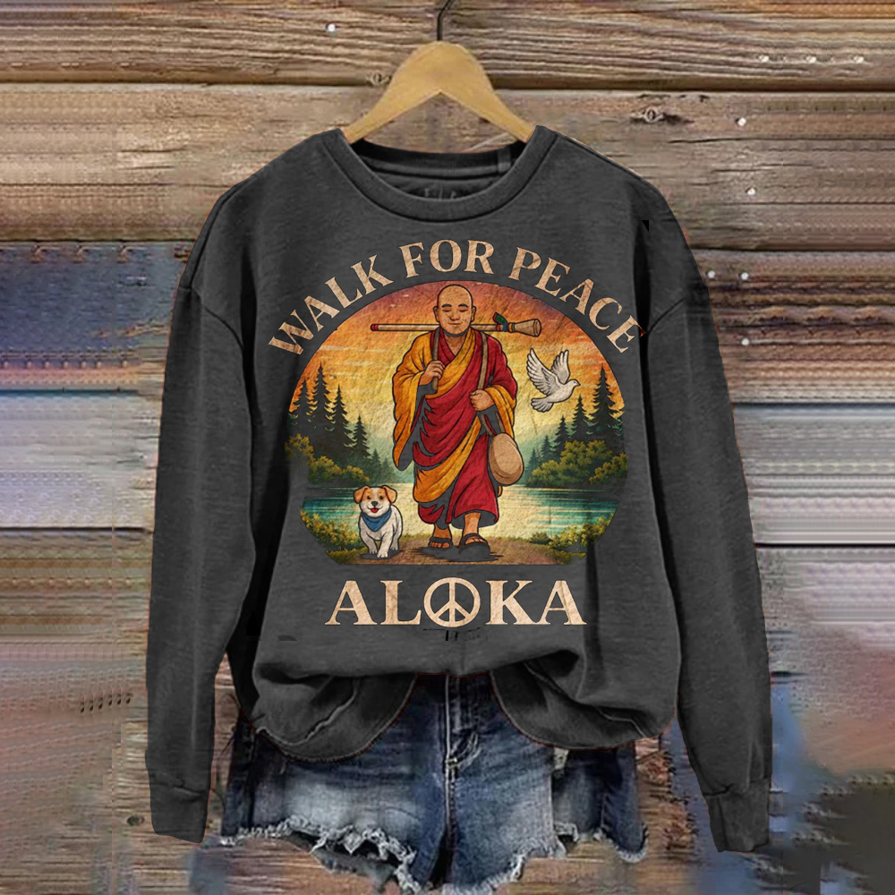 Retro Peace Monk And Alok Dog Print Crew Neck Sweatshirt