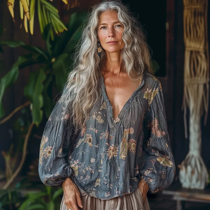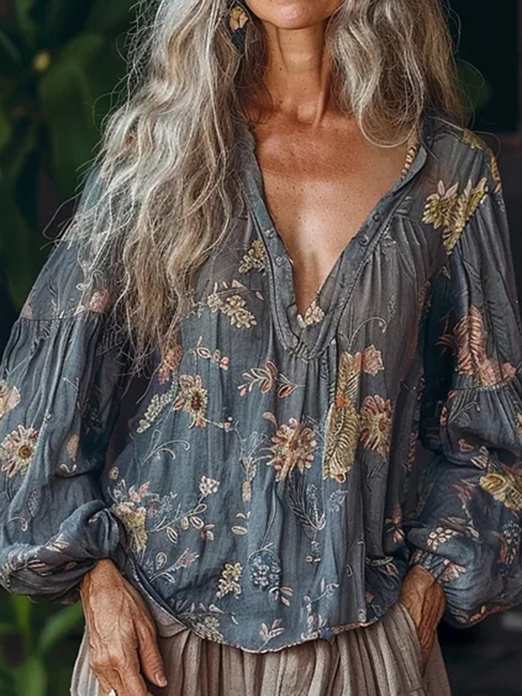 Vintage Bohemian Floral Linen Art Print Long Sleeve V-neck Shirt