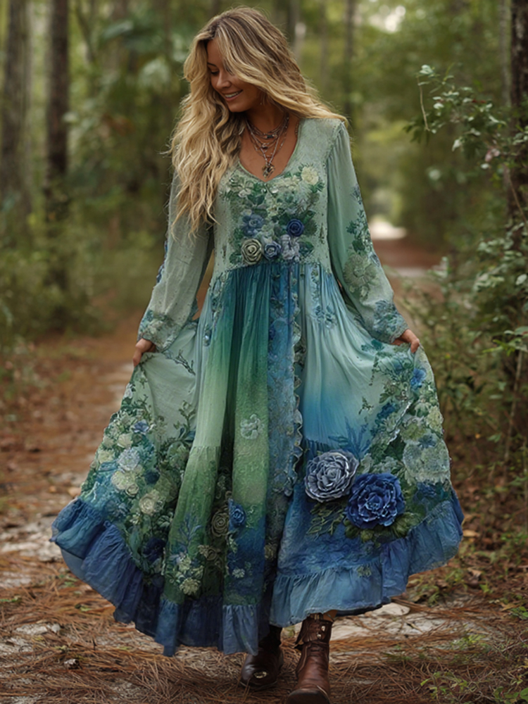 Vintage Classy Gradient Purple Lavender And Floral Embroidered Maxi Dress