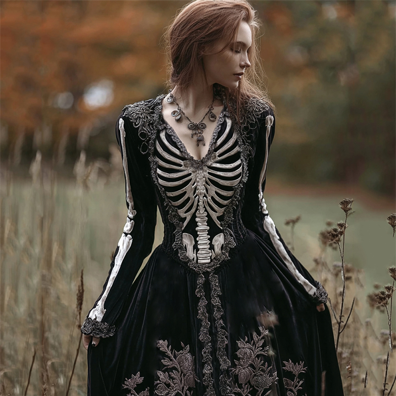 Vintage Classy Skeleton Floral Beaded Trim Velvet Maxi Dress