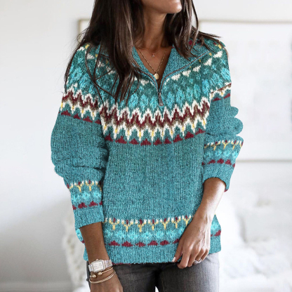Vintage Ethnic Wave Pattern Jacquard Zipper Stand Collar Sweater