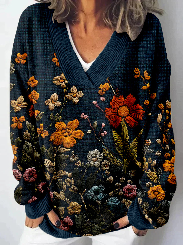 Vintage Fall Crochet Flower Embroidery Cozy Knit Sweater