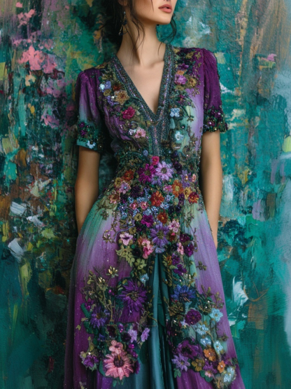 Vintage Floral Embroidered Gradient Linen Maxi Dress