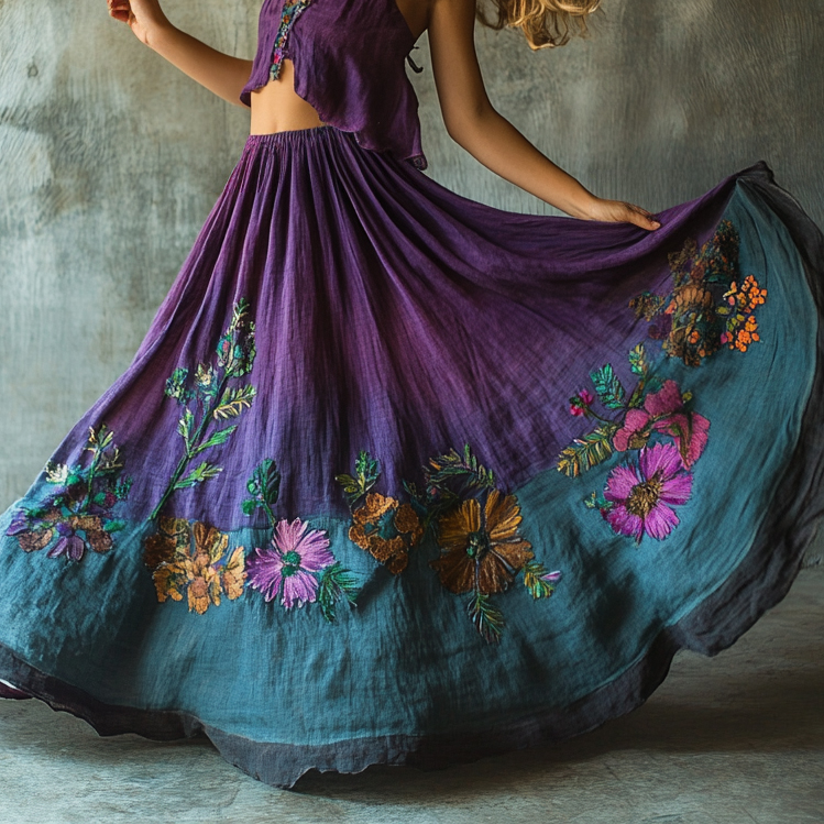 Vintage Floral Embroidered Gradient Pattern Art Linen Blend Skirt