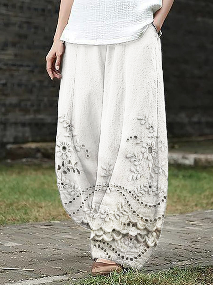 Vintage Floral Embroidered Lace Hem Flowy Wide Leg Pants