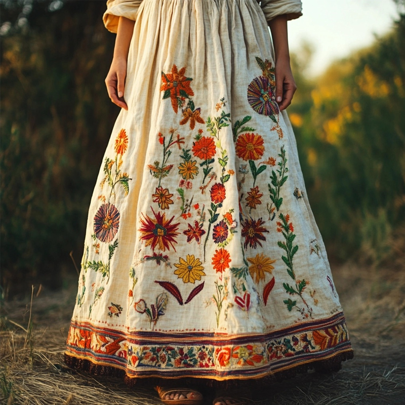 Vintage Floral Embroidered Linen Blend Skirt