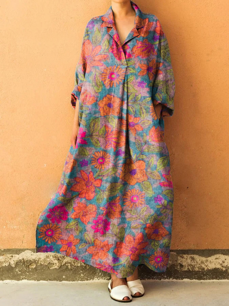 Vintage Flower Print Lapel Long Sleeve Loose Maxi Dress