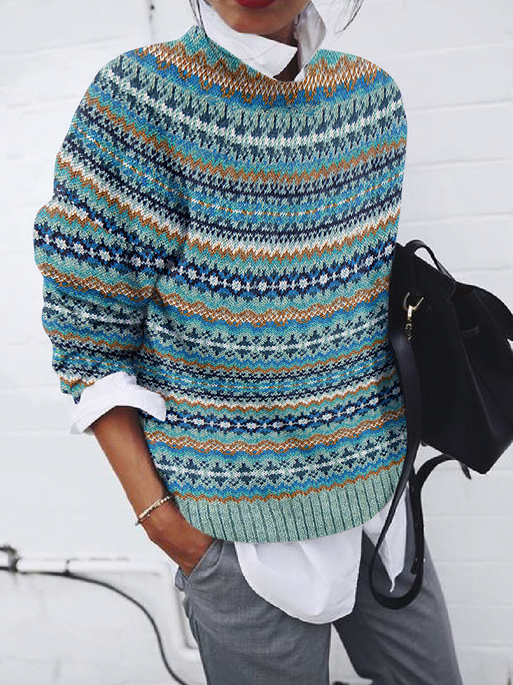Vintage Geometric Jacquard Pattern Crew Neck Sweater
