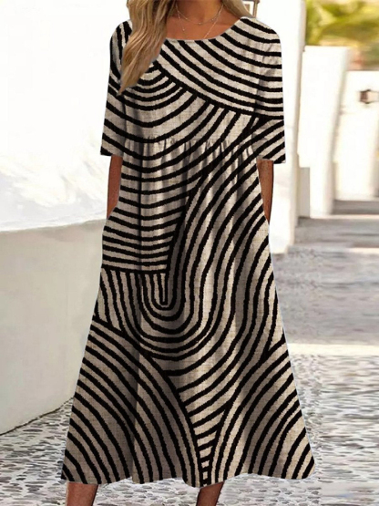 Vintage Geometric Stripes Art Linen Blend Maxi Dress