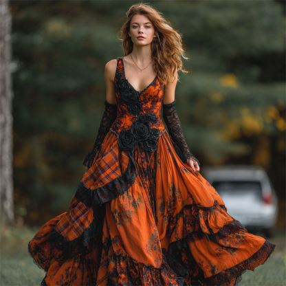 Vintage Gothic Black Roses Plaid Flowy Maxi Dress