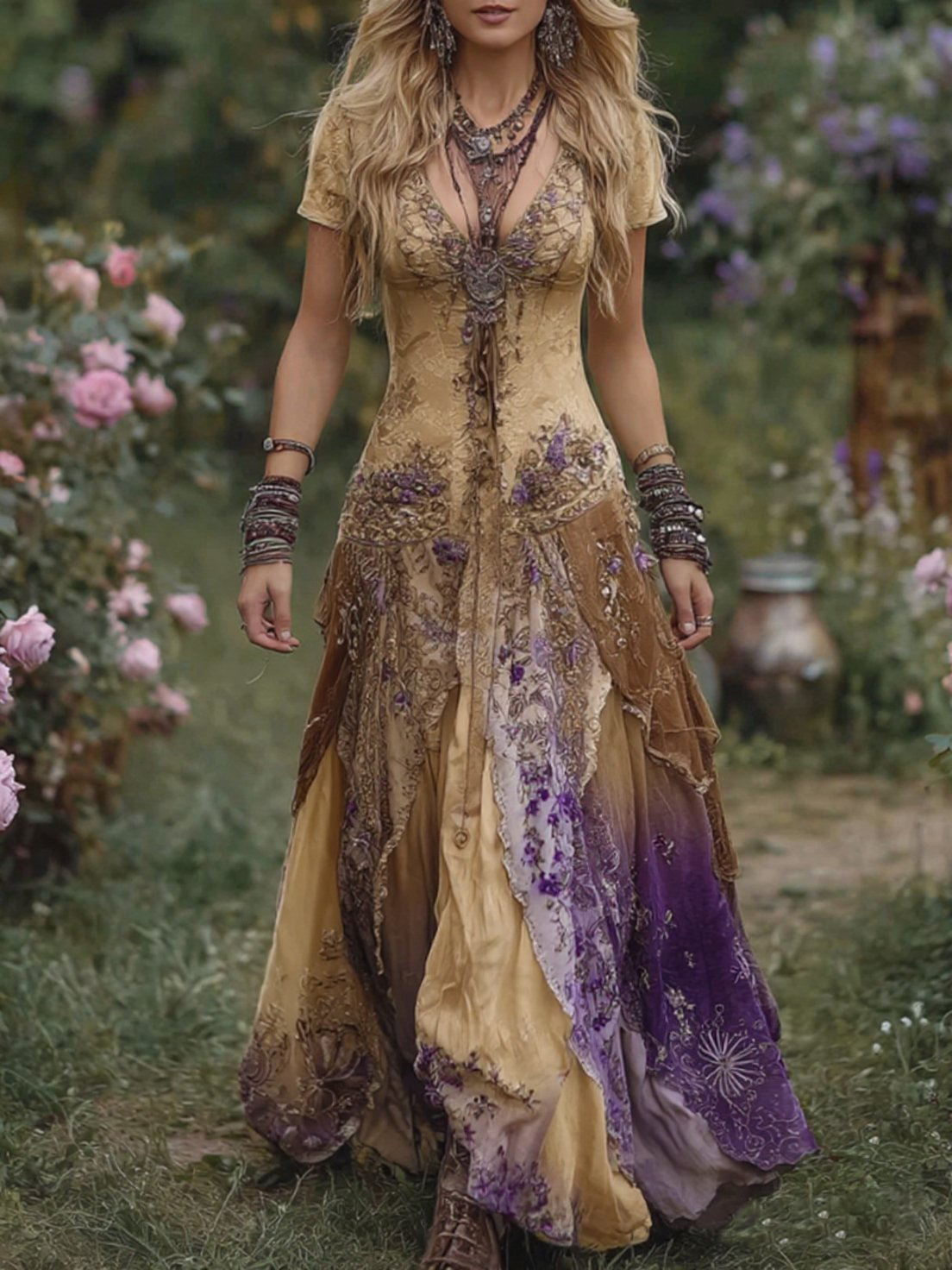 Vintage Gradient Purple Floral Embroidered Linen Maxi Dress