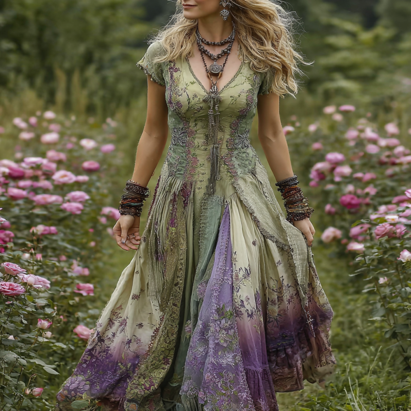 Vintage Gradient Purple Floral Embroidered Linen Maxi Dress