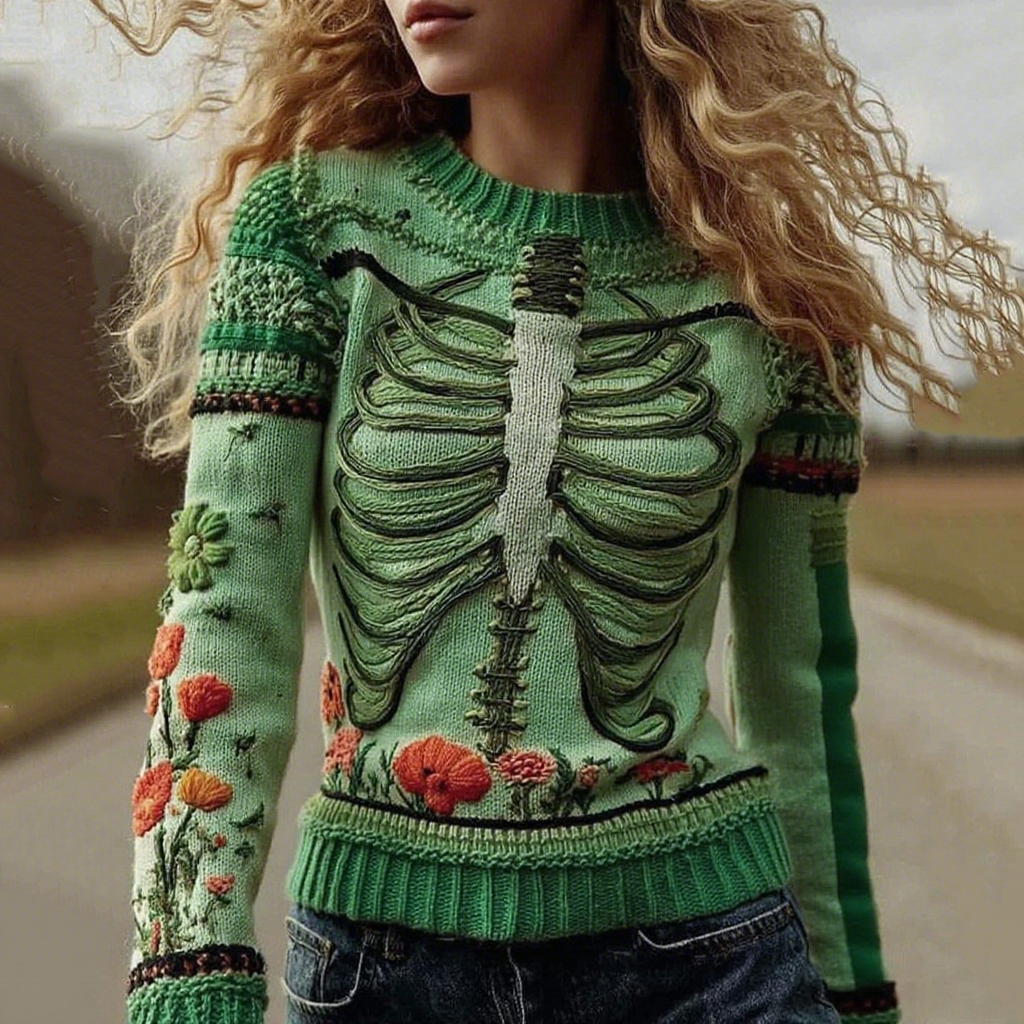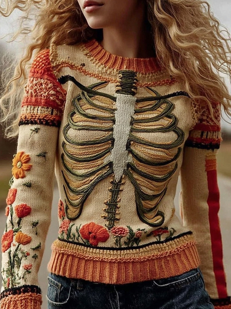 Vintage Halloween Anatomy With Floral Art Chunky Knitted Sweater