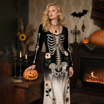 Vintage Halloween Skeleton Bones With Roses Flowy Velvet Maxi Dress