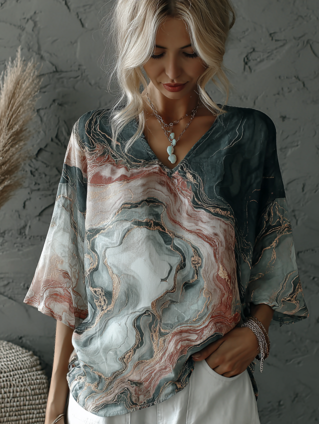 Vintage Marble Texture Collection Bohemia Women Style Gradient Gilded Pattern Linen T-shirt