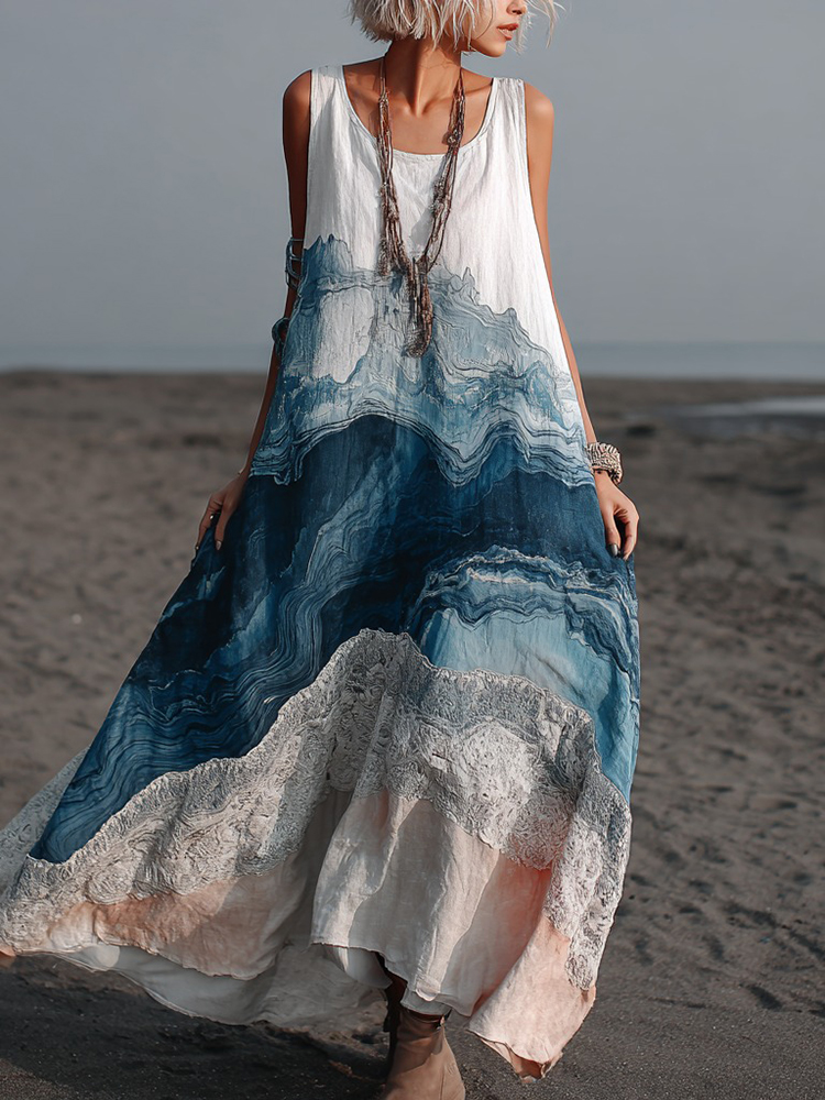 Vintage Marble Texture Collection Retro Bohemia Gradient Gilded Pattern Linen Maxi Dress
