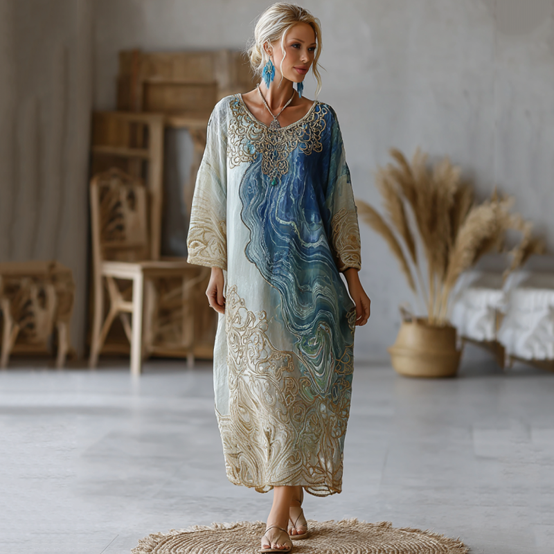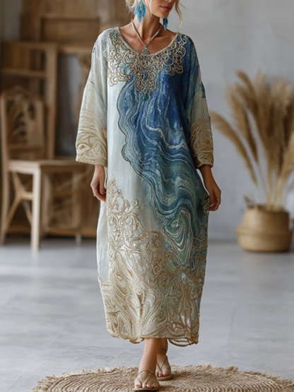 Vintage Marble Texture Collection Retro Bohemia Women Style Gradient Gilded Pattern Linen Long Dress