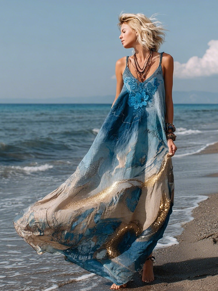 Vintage Marble Texture Collection Retro Bohemia Women Style Gradient Gilded Pattern Linen Maxi Dress
