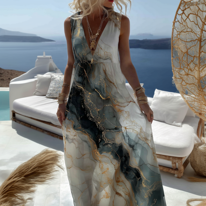 Vintage Marble Texture Collection Retro Bohemia Women Style Gradient Gilded Pattern Linen Maxi Dress