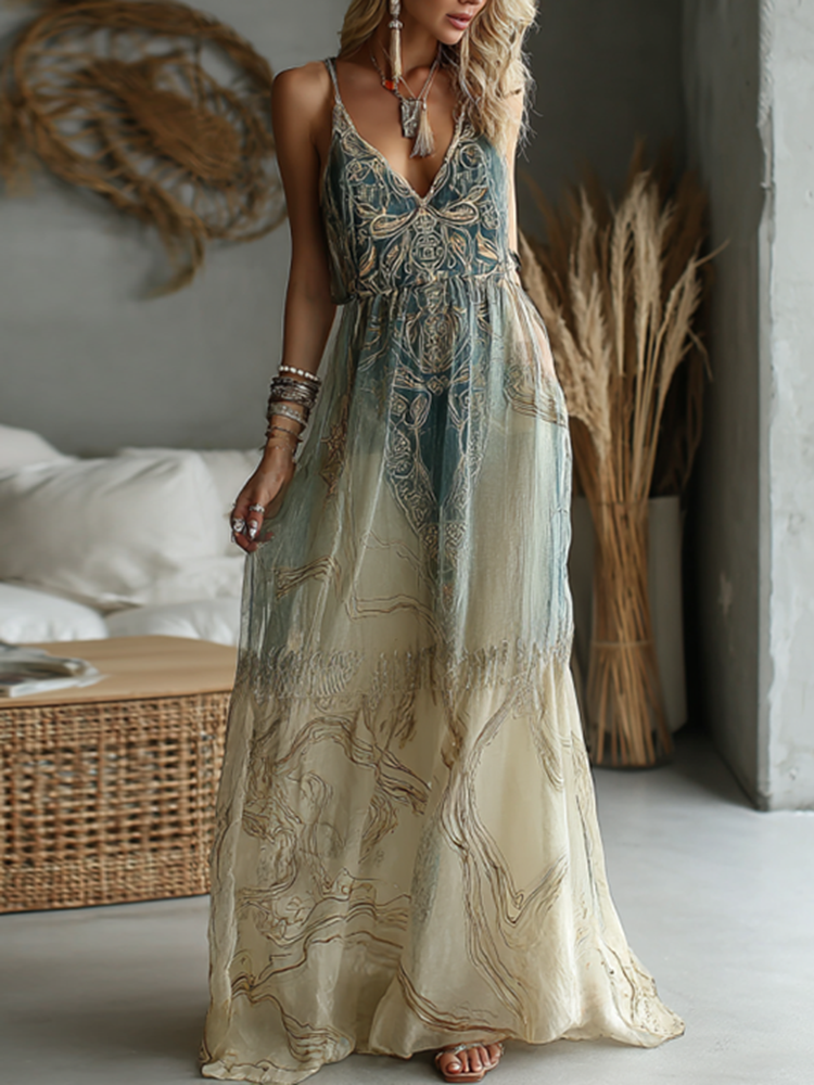 Vintage Marble Texture Collection Retro Bohemia Women Style Gradient Gilded Pattern Linen Suspender Long Dress