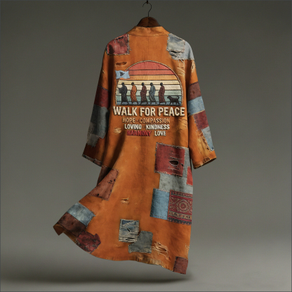 Vintage Peace For Walk Art In Patchwork Print Linen Long Kimono