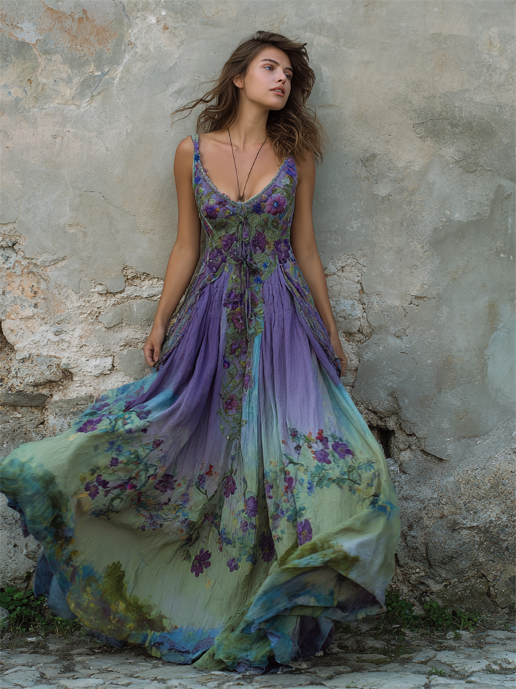 Vintage Purple Floral Embroidered Gradient Flowy Linen Maxi Dress