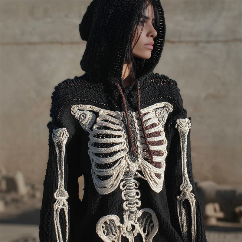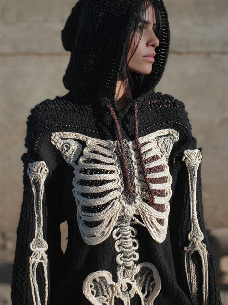Vintage Skeleton Anatomy Beaded Hooded Cozy Knit Sweater