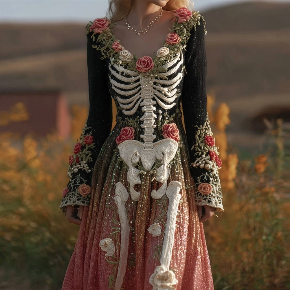 Vintage Skeleton Roses Glitter Gradient Flowy Maxi Dress