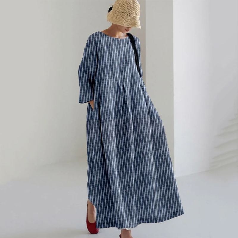 Vintage Stripe Pocket Casual Round Neck Maxi Dress