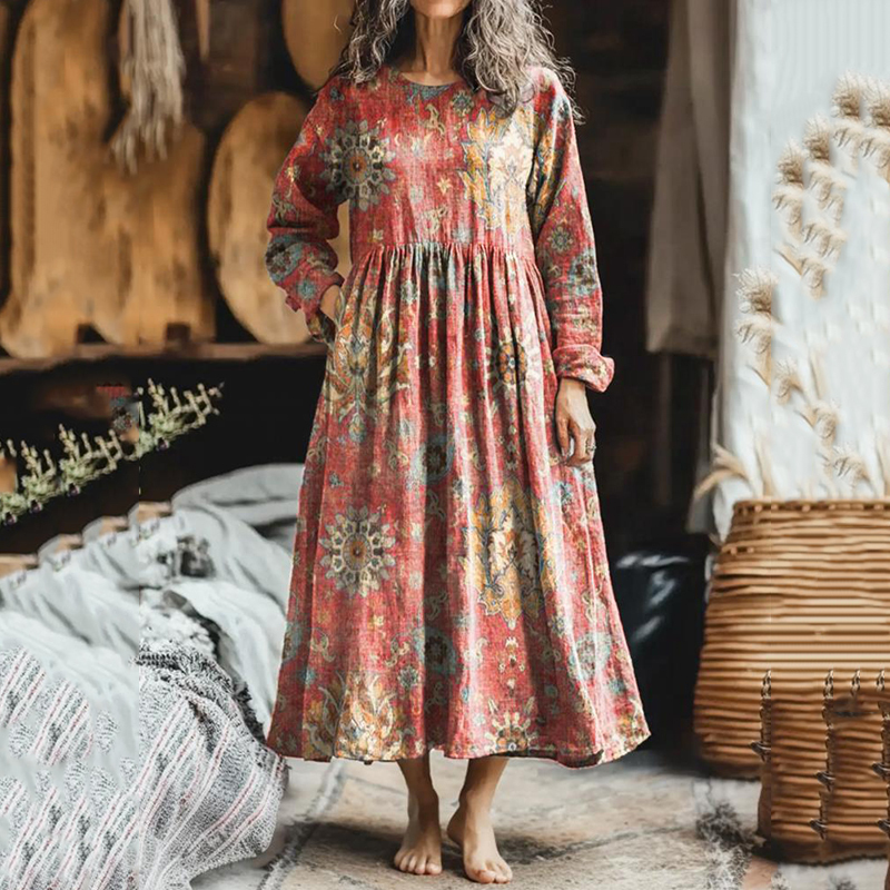 Vintage Totem Floral Pattern Printed Cotton And Linen Dress