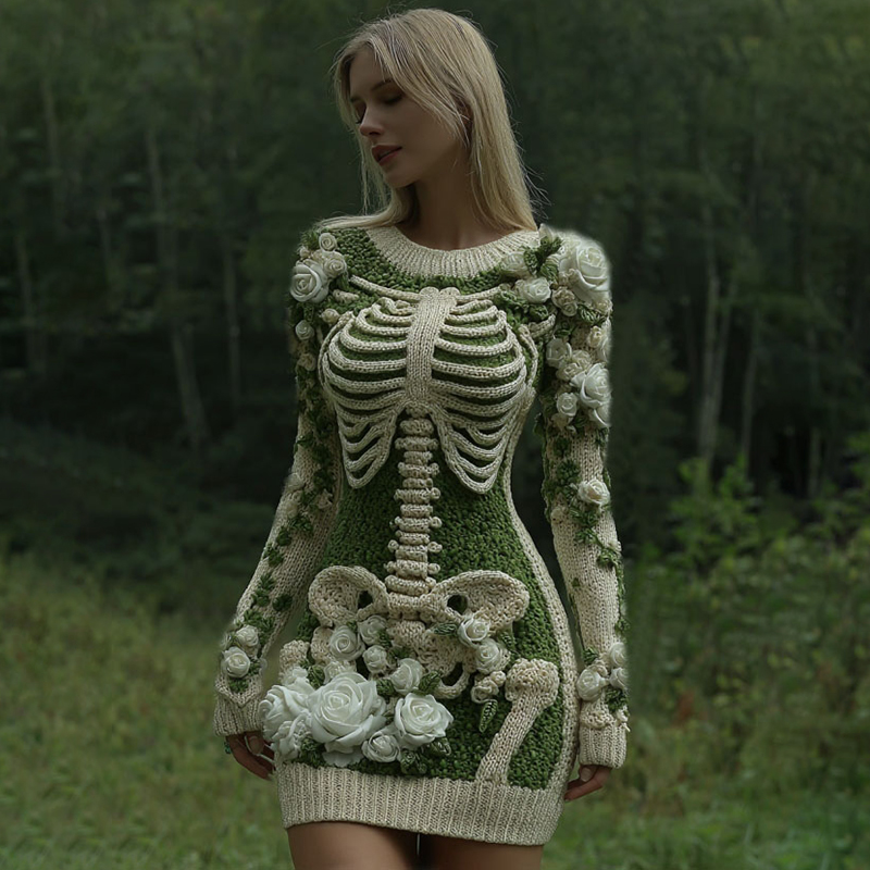 Women's Vintage Skeleton With White Rose Art Cozy Sweater Dress