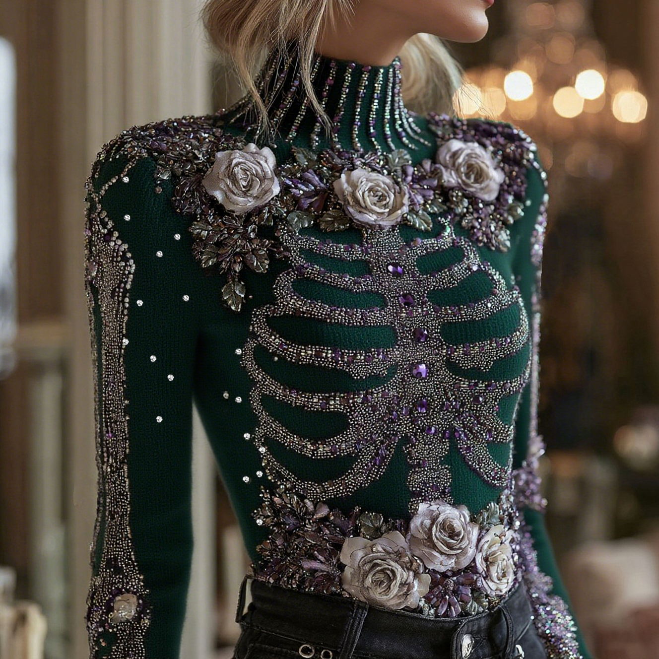 Women's Halloween Bloody Floral & Skeleton Art Turtleneck Slim Sweater