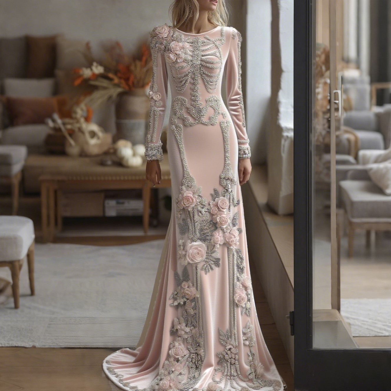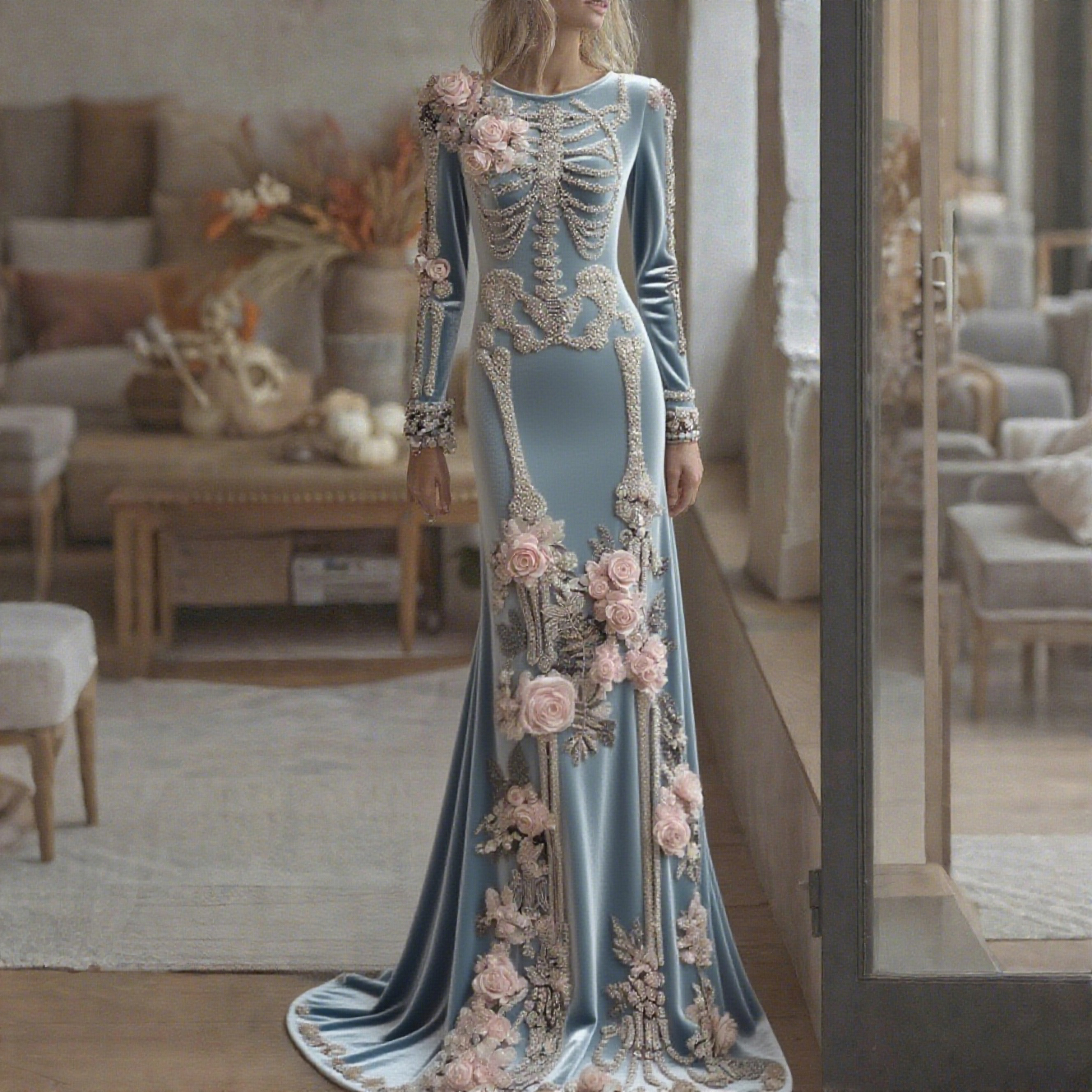 Women's Halloween Dark Gothic Rose Skeleton Velvet Round Neck Maxi Dress