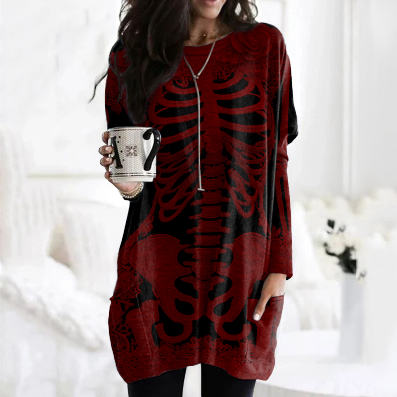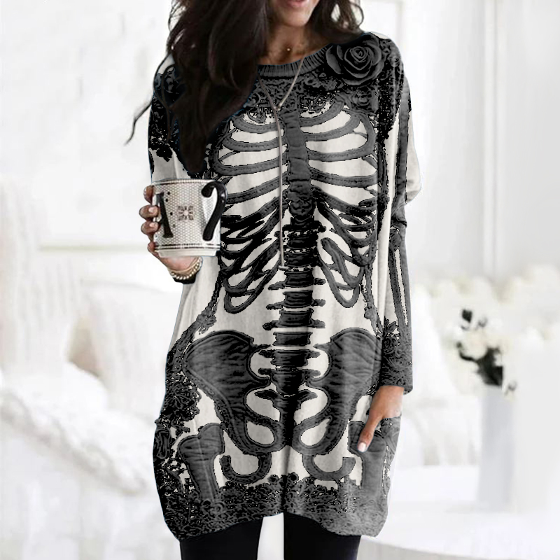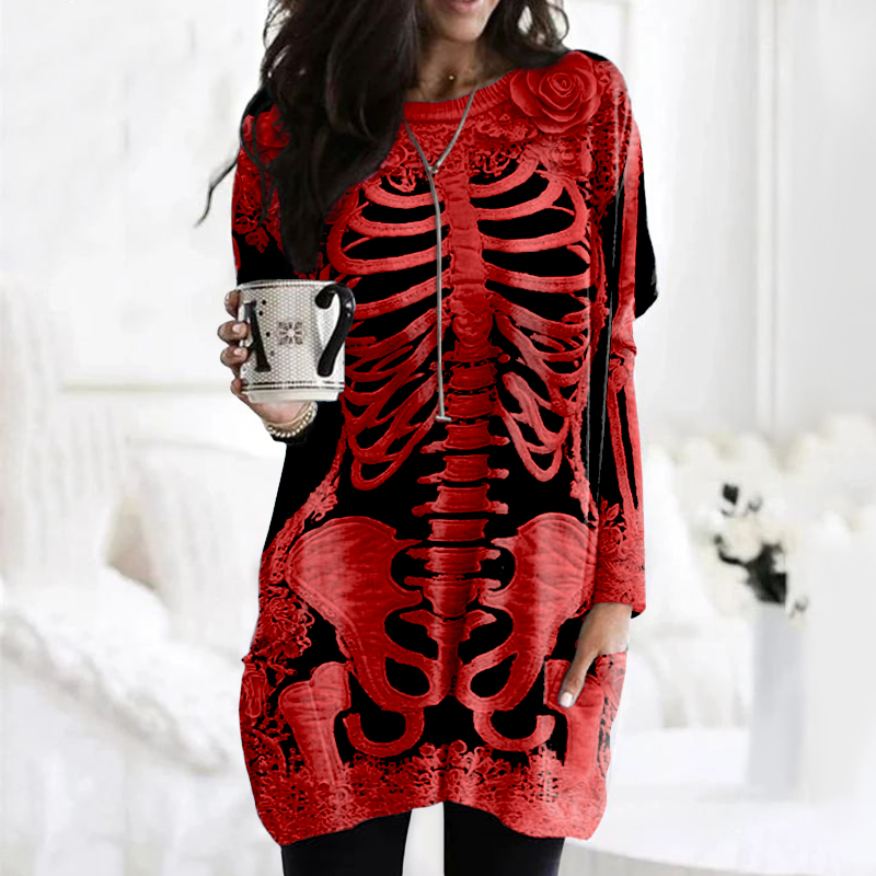 Women's Halloween Skeleton Bones With Rose Art Cozy Knit Turtleneck Mini Sweater Dress