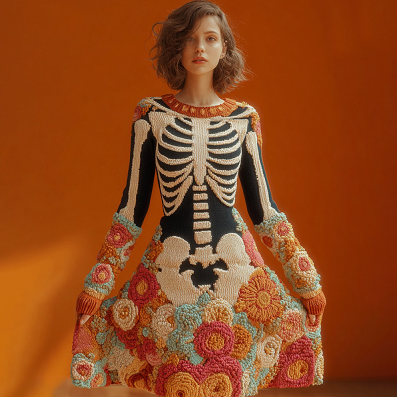 Women's Halloween Warm Tone Skull Rose Embroidered Dress