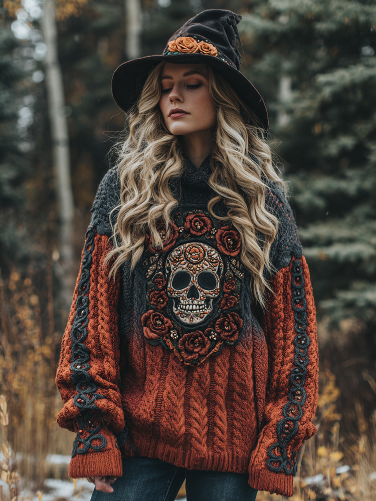 Women's Viking Tribal Jacquard Celtic With Rose And Skull Inspired Chunky Knit Hooded Sweater