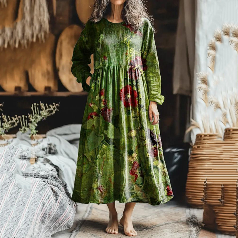 Women's Vintage Oil Painting Floral Art Pattern Print Pocket Dress