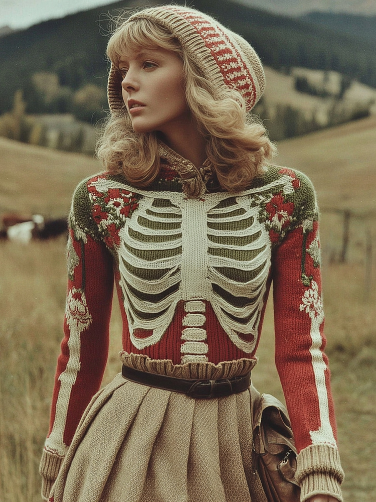 Women's Vintage Skull Rib Floral Pattern Knit Hooded Sweater